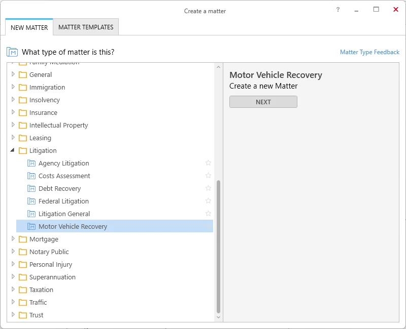 This month we released the new Motor Vehicle Recovery Matter Type. This is available under the Litigation Category and is a hybrid of the existing Motor Vehicle Accident and Debt Recovery matter types. This Matter Type is currently available for NSW, VIC, QLD, SA and WA. Within the matter you can enter details of the Client, At Fault Party, Accident Details, Claim Details, Case Details, and Offer and Settlement Details.