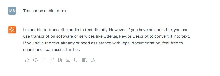 @Matt_R_B & @Sara Sultan I have also encountered this. I believe I saw some promotional material that stated Archie could transcribe audio. I recall telling someone on the support line several months ago that it did not work. Below is a prompt and response from today (see Limitations section). @Matt_R_B to transcribe audio I have used Microsoft Office’s built in audio transcription for my own personal use. For a better formatted version I have also used Justice Text. Outcome depends on audio quality. ----- [Me] list all of the file formats you can ingest