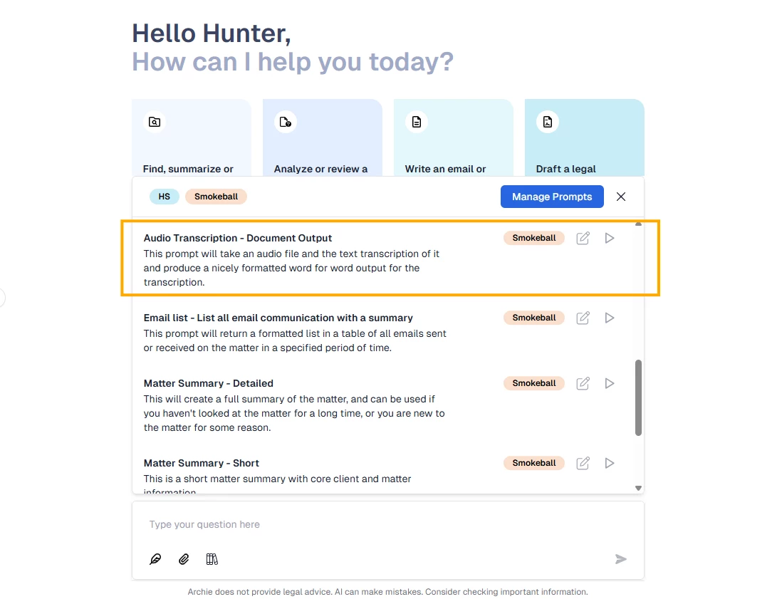 Once you have uploaded the audio file to the matter, you can ask Archie to create a transcript if you have Archie enabled.
