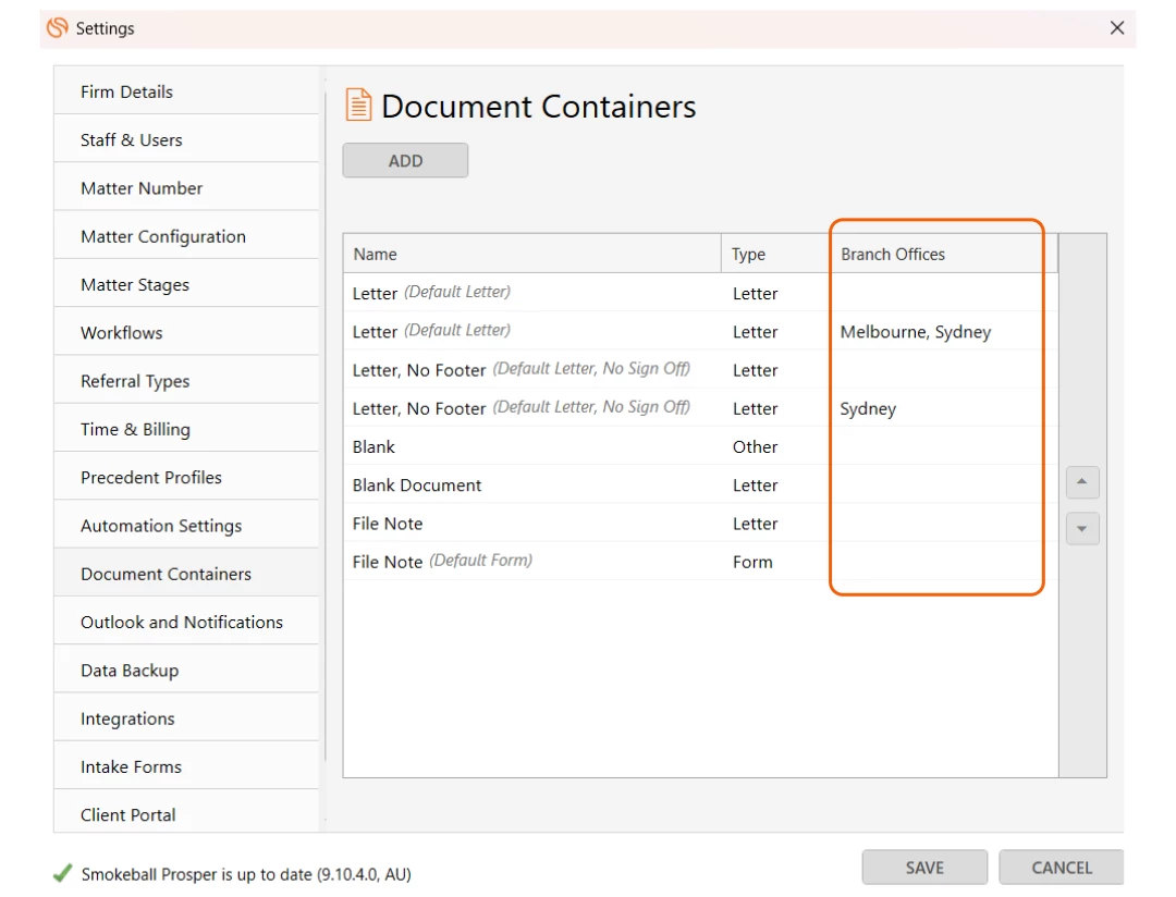Create branch-specific document containers to easily manage different letterheads, footers and branding across offices. Smokeball applies the correct container to documents based on the matter’s branch, keeping files polished and consistent without manual updates.