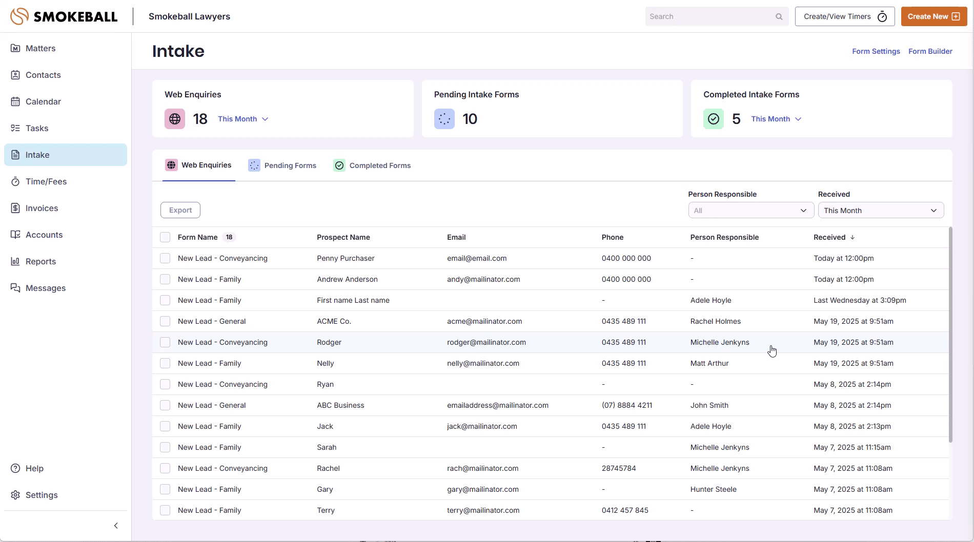 Get ready for your new Intake Homepage, built to help you stay on top of every web enquiry, follow-up, and client opportunity—all in one place.